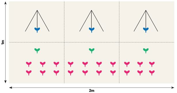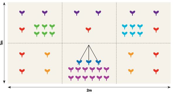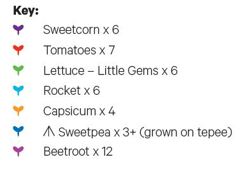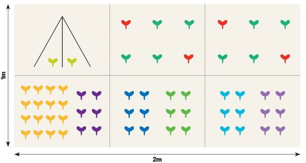 These planting plans call for planting quite densely which is great to pack in a real variety of fruit and veges, just take care to water and feed regularly. They are based on a 1m x 2m garden bed, split into 6 equal sections. If your garden is larger or smaller, simply add or remove sections as needed.