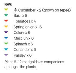 This garden planting plan has everything you need for delicious summer salads! If it is still cooler in your region you may want to leave spaces and wait until later in October to plant some of the more tender plants such as tomatoes and cucumbers - or at least use a cloche to protect them from the elements.