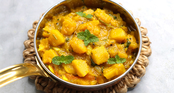 - Add oil and saute the chopped onion for a couple of minutes before adding garlic, ginger & diced pumpkin.