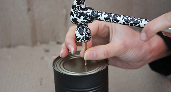 - As the tin cans have no drainage holes, use a hammer and nail to create three drainage holes at the bottom of each can.