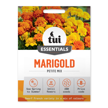 Tui Marigold Seed - Petite Mix is a dwarf French variety in a mix of colours. This compact variety grows to around 25cm and is a reliable companion plant that keeps aphids away. Deadheading regularly will provide a longer flowering display.